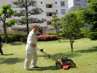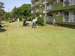 この団地は、今年で築39年目を迎えますが、植栽管理費削減のためかなり昔から居住者参加による雑草取りと芝刈りを実施しています。
